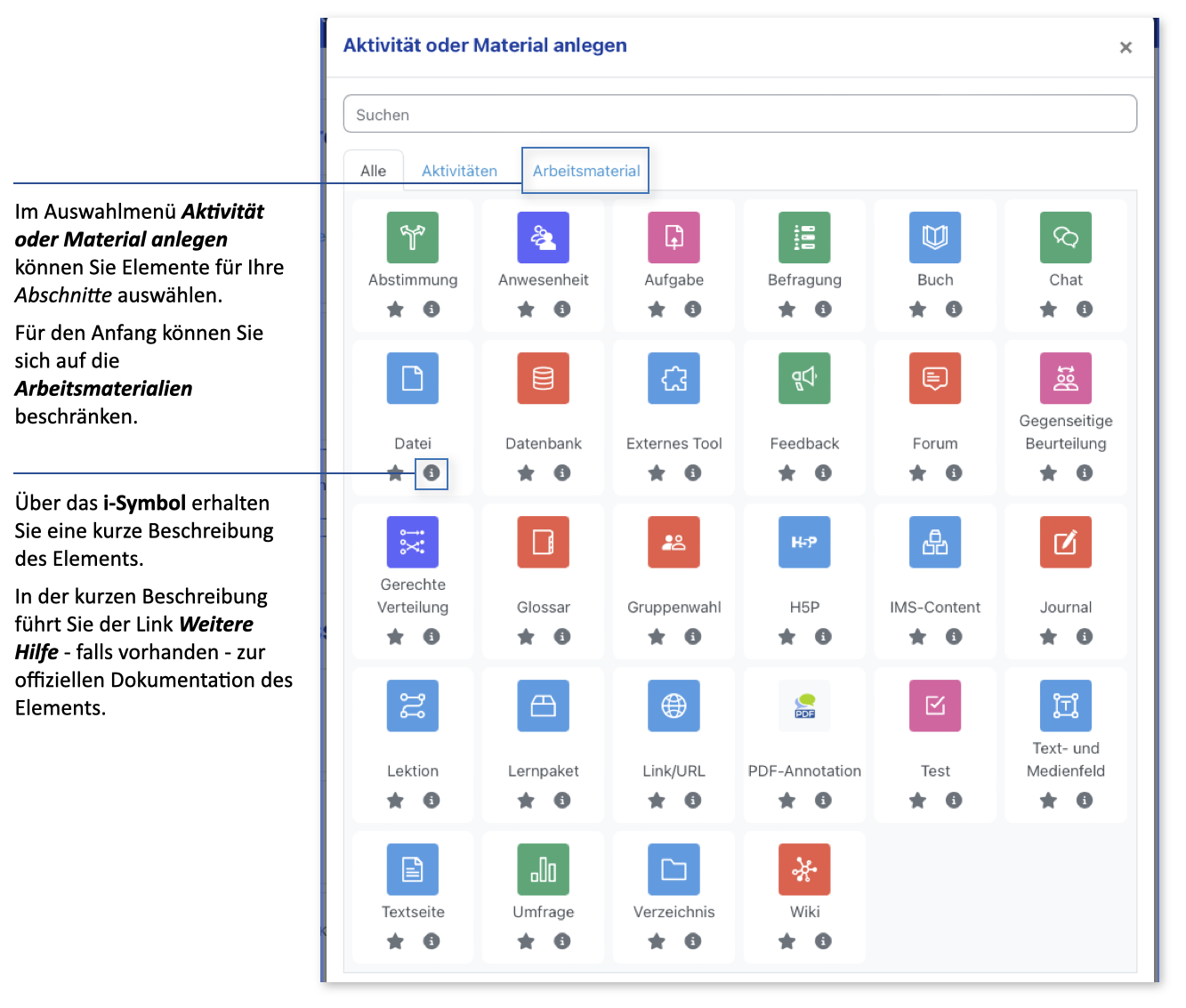 Wenn Sie im Übergangsmoodle auf Fragezeichen- oder Informations-Symbole klicken,