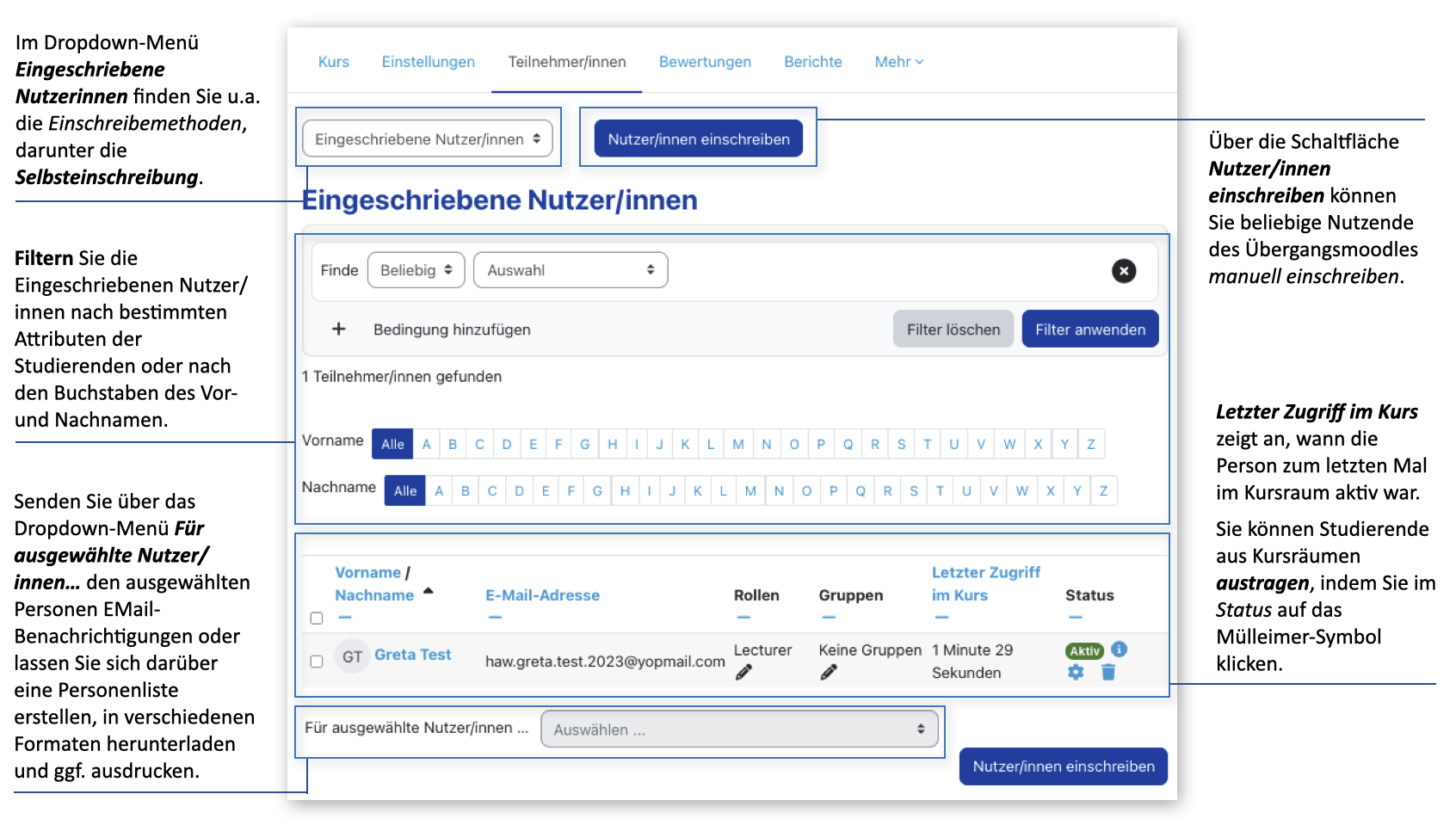 Aufgabe 2: Schreiben Sie die Test-Studentin Klara Test manuell in der Rolle Student in Ihren Kursraum ein (im nächsten Kapitel zeigen wir Ihnen, wie Sie sie wieder austragen).