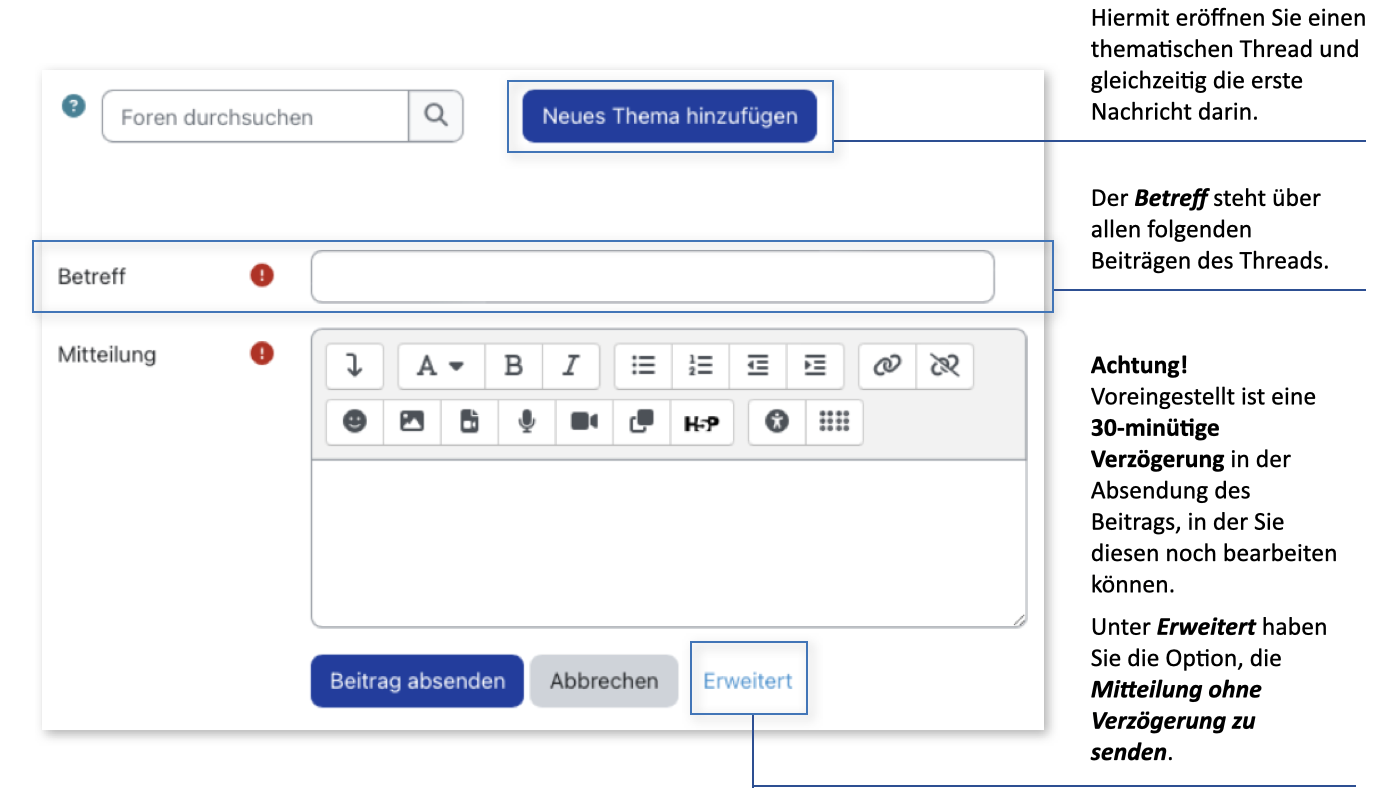 Foren sind vielfältig einsetzbar als Rundmailer, für gruppenbezogene oder kursumfassende Diskussionsrunden; Aktivitäten wie z.B. das Glossar oder die PDF-Annotation erlauben gegenseitiges Kommentieren.