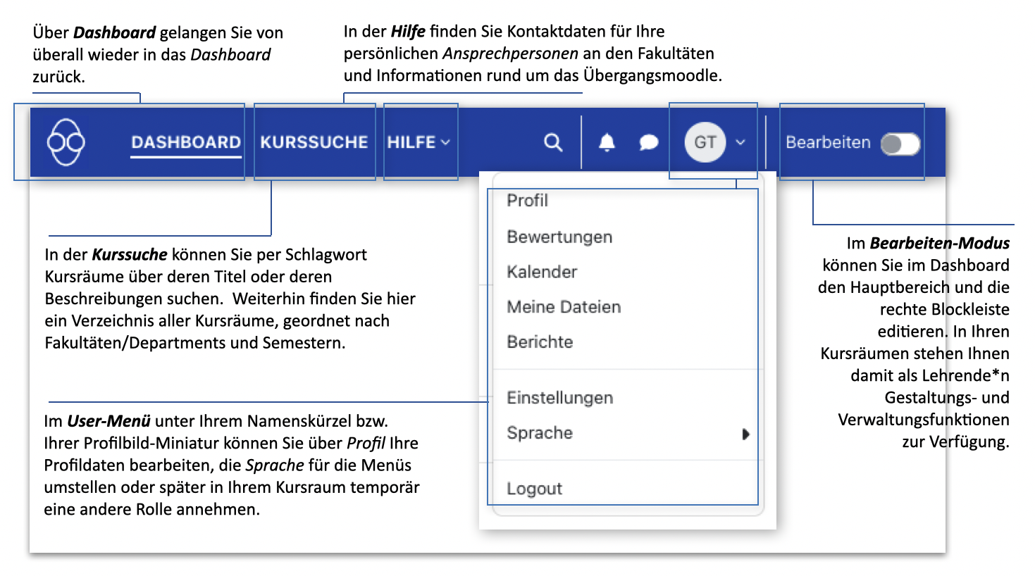 Das blaue Kopfleistenmenü ist überall im Moodle sichtbar - sowohl beim Login, im Dashboard als auch in den Kursräumen. Welche Optionen Ihnen dort dargestellt werden, hängt teilweise von der Rolle ab, die Sie auf der aktuellen Seite innehaben: Wenn Sie dort Gestaltungsrechte besitzen, steht Ihnen z.B. die "Bearbeiten"-Option zur Verfügung.