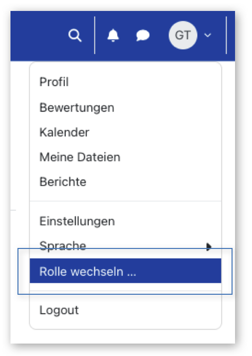 Sie finden Funktion zum Wechseln Ihrer Rolle im User-Menü in der Kopfzeile; klicken Sie entweder auf Ihre Initialien oder Ihr rundes Profilbild dort. Klicken Sie dort auf die Option Rolle wechseln... und schlüpfen Sie temporär in die Rolle Student.