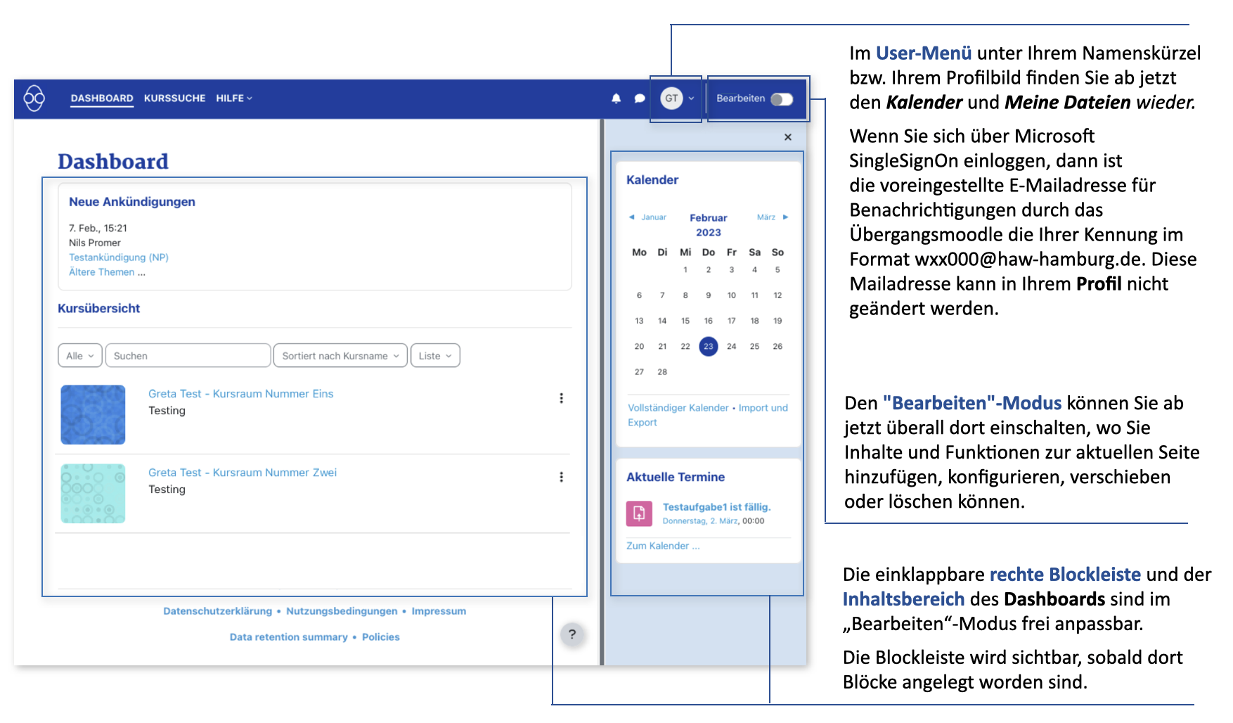 Mit dem Übergangsmoodle ist an der HAW Hamburg zu Beginn des Sommersemester 2023 ein Sprung der Moodle-Software-Version und gleichzeitig ein Layoutwechsel erfolgt (Moodle Version 4.x und Boost Union-Theme). Wir stellen ihnen in sechs Kapiteln kurz einige der Änderungen vor: beim Login, im Dashboard, im Kursraum, bei der Bearbeitung des Kursraums, bei der Auswahl von Inhalten sowie bei der Bearbeitung von Inhalten.