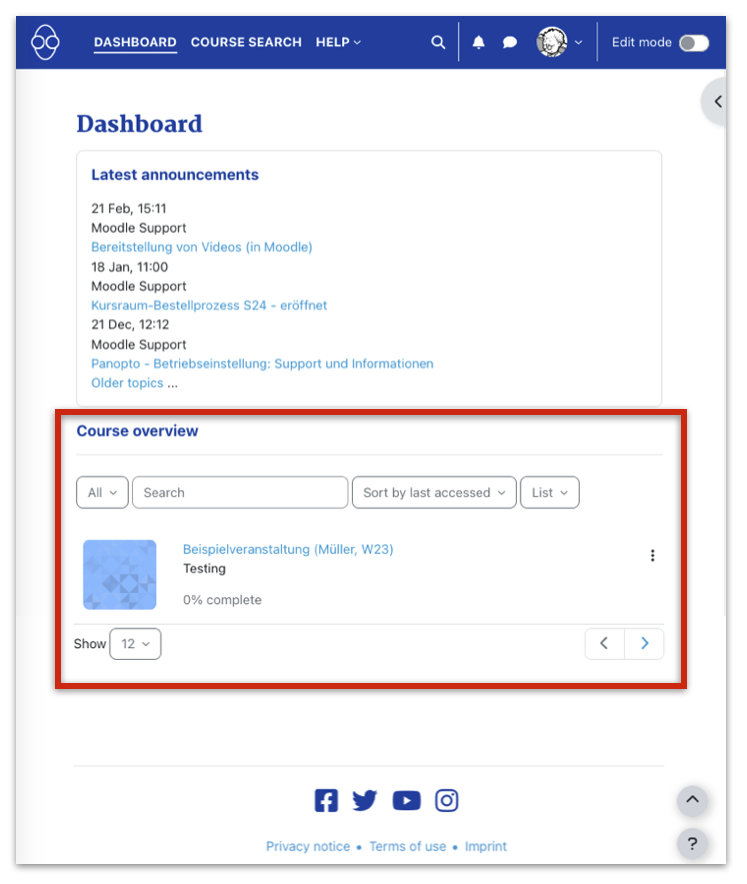The Dashboard provides you - among other useful functions - with an overview of the virtual course rooms in which you are enrolled in at the HAW Moodle.