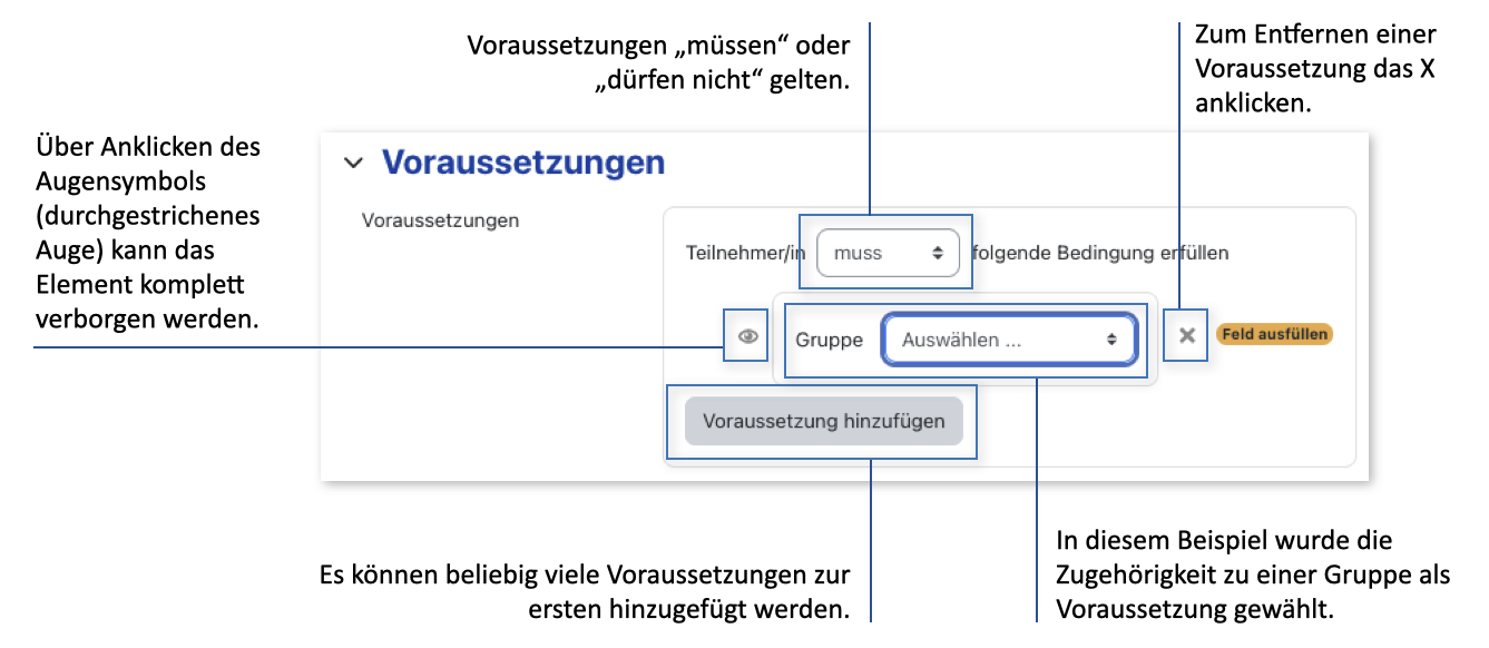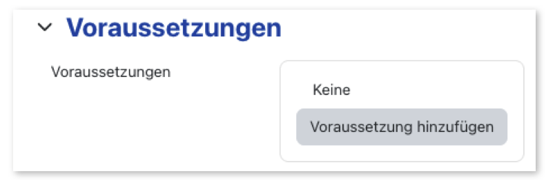 Jede Aktivität, jedes Material und jeder Themenabschnitt hat in den Einstellungen als Option Voraussetzungen. Über