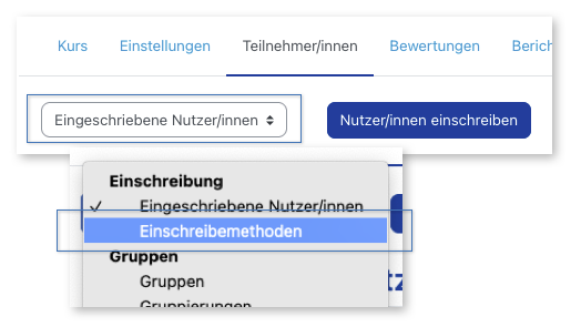 - Gehen Sie im Kursraum zum Teilnehmer/innen-Screen. Sie finden dort unter Eingeschriebene Nutzer/innen ein Dropdownmenü. Wählen Sie dort die Option Einschreibemethoden aus.
