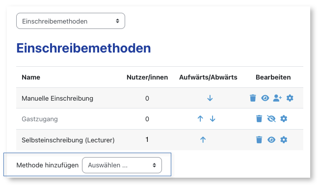 eine Einschreibemethode in Ihren Kursraum eingetragen haben, deaktivieren Sie diese Methode nicht nachträglich (Symbol durchgestrichenes Auge)!