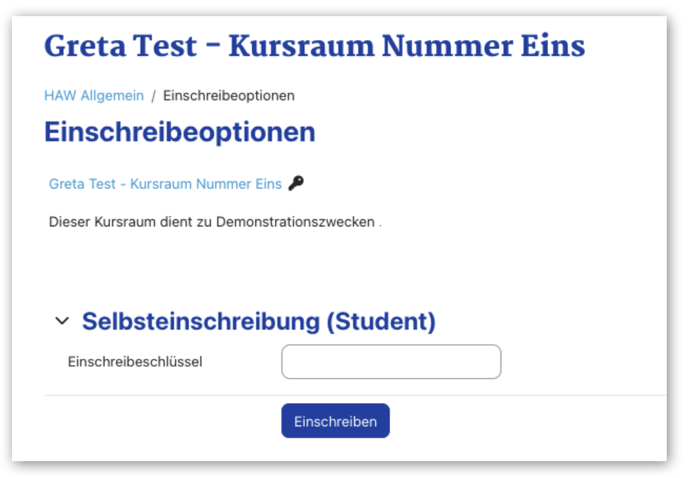 Wenn Ihre Studierenden diese URL eingeben bzw. einen Link mit dieser URL folgen, gelangen Sie auf die Webseite mit den Einschreibeoptionen Ihres Kursraums (s.u.). Eine einmalige Eingabe des Einschreibeschlüssels (Passwort) sorgt dann für den dauerhaften Zugang zu Ihrem Kursraum.Die Selbsteinschreibung aus der Sicht Ihrer Studierenden:
