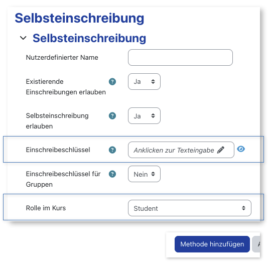 Falls Sie den Einschreibeschlüssel leer lassen, kann sich jede*r Moodle-Nutzende frei in Ihren Kursraum einschreiben.