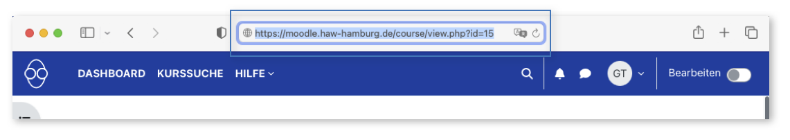 - Klicken Sie jetzt im Menü auf Kurs und kopieren Sie sich die URL aus der URL-Zeile Ihres Browsers (s.u. am Beispiel eines Safari-Browsers).