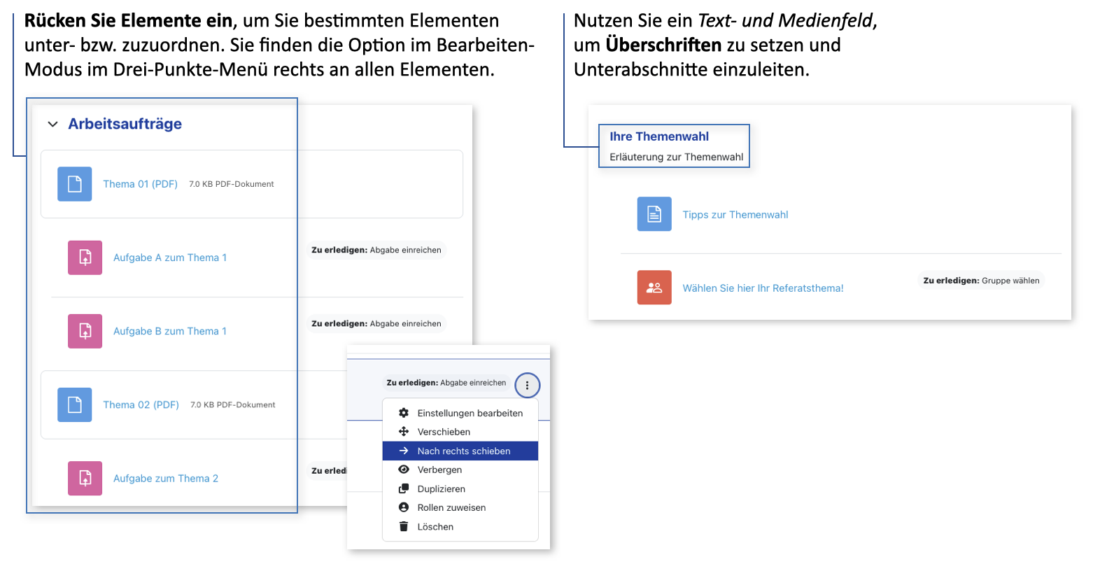 Unterstützen Sie Übersichtlichkeit und Navigierbarkeit Ihres Kursraums, indem Sie eine thematische oder funktionale Strukturierung auf den ersten Blick sichtbar machen.