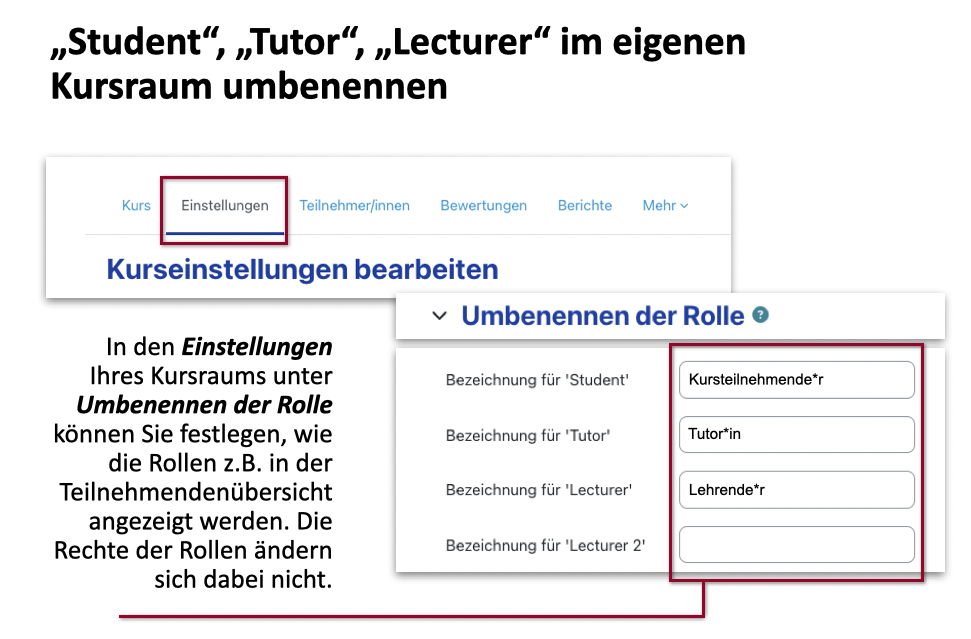 Geben Sie dazu in den Einstellungen des Kurses unter Umbenennen der Rolle die gewünschten alternativen Bezeichnungen ein und speichern Sie die Änderungen.