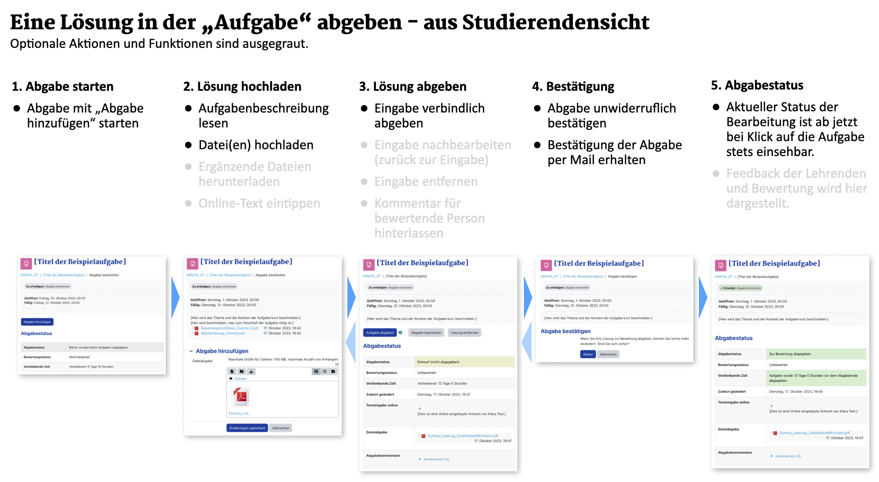 Studierende durchlaufen folgende fünf Schritte für eine Abgabe der Lösung: