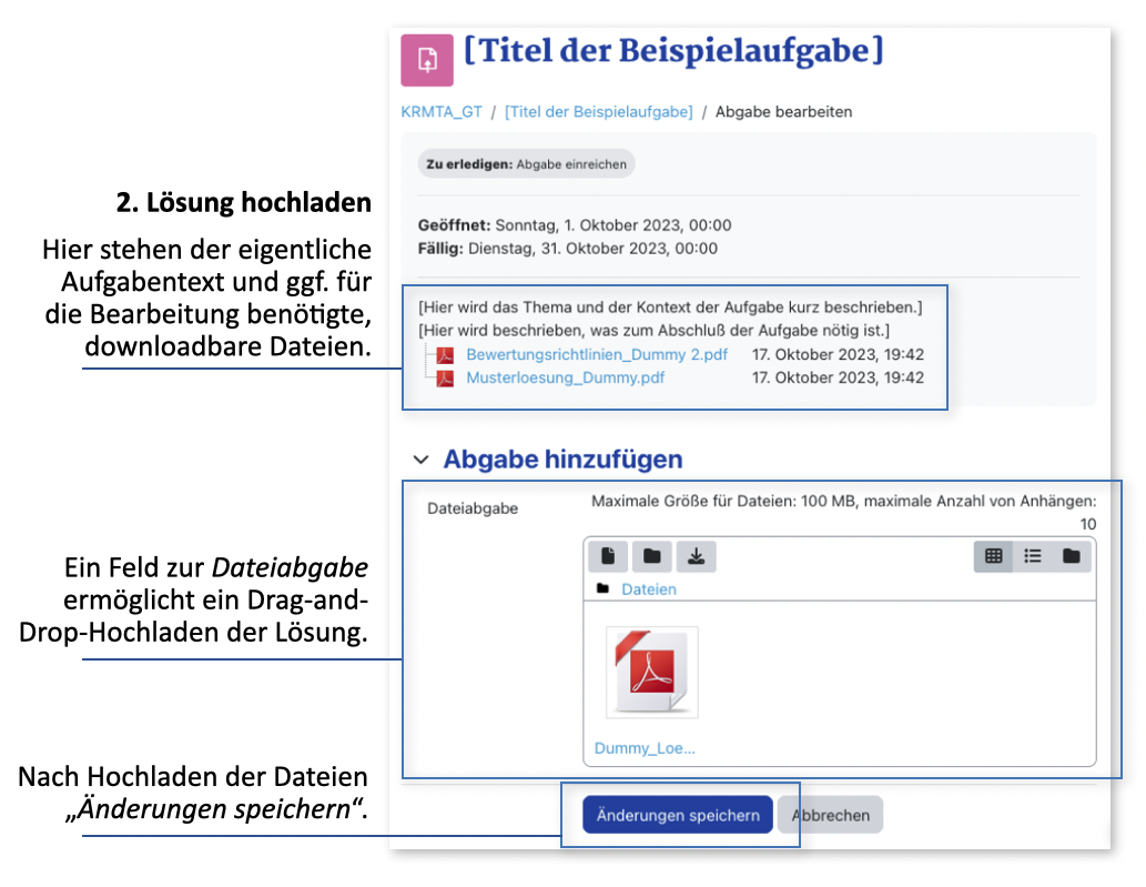 Studierende erhalten nach Klick auf die Aufgabe die Aufgabenbeschreibung, können ggf. zusätzliche Dateien herunterladen und ihre Lösung in Form hochladbarer Dateien oder einer Online-Texteingabe abgeben.