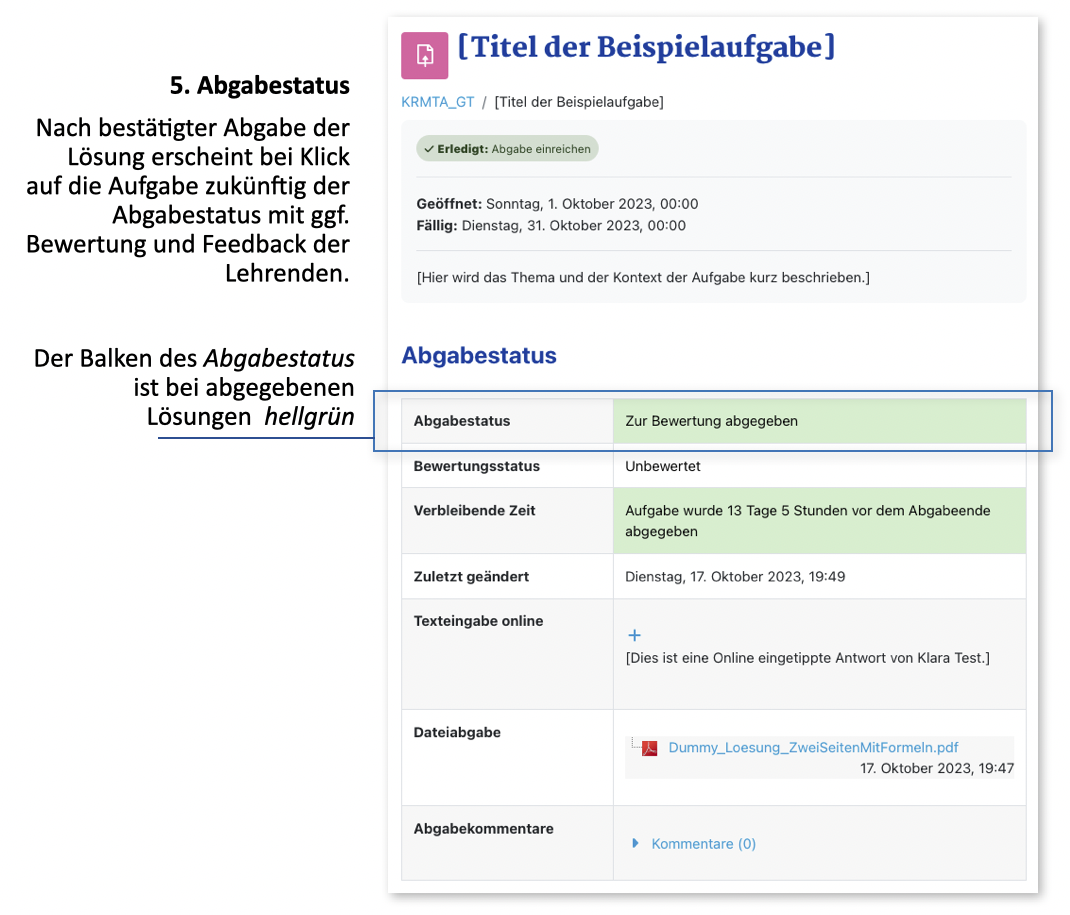 Die Tabelle des Abgabestatus enthält für die Studierenden alle aktuellen Informationen über ihre Abgabe:
