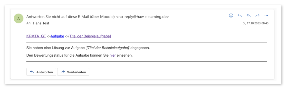 Wenn auf "Weiter" geklickt wurde, wird eine Systemnachricht per Mail als 'Quittung' für die Abgabe (hier klicken für einen Screenshot) an die Studierenden gesendet und weiter auf den Status-Screen gesprungen.