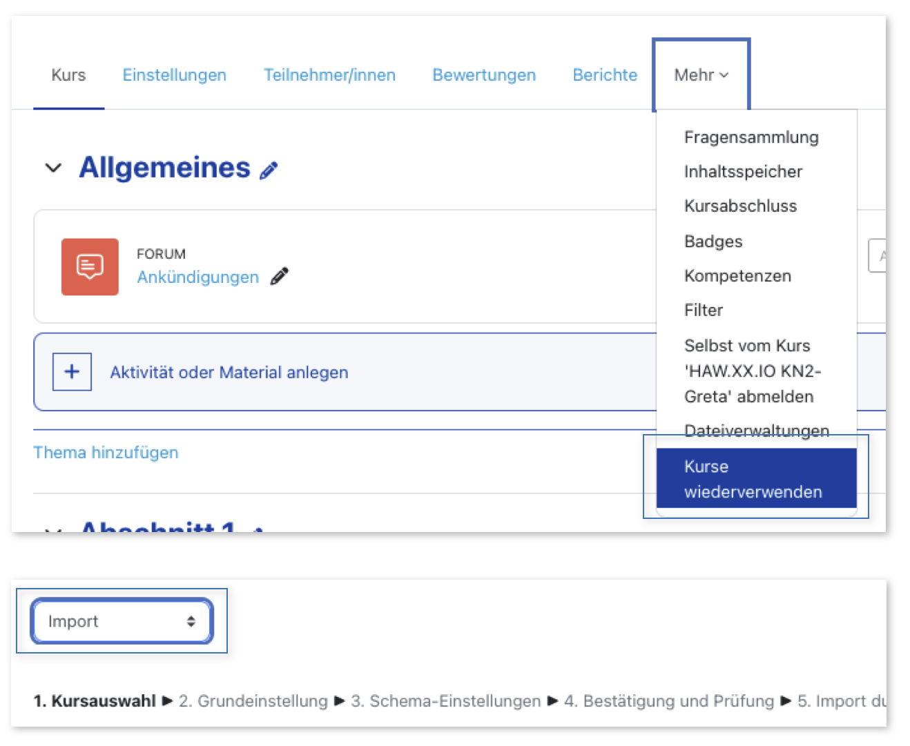 Wählen Sie im Kursraummenü unter Mehr -> Kurse wiederverwenden -> Dropdownmenü: Import (diese Option ist voreingestellt).
