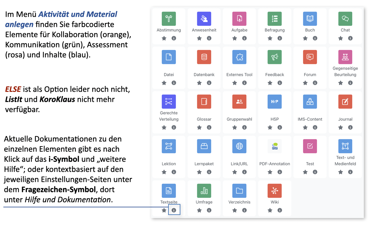 Für Ihren Kursraum stehen Ihnen knapp 30 Elemente zur Verfügung, die Sie im Bearbeiten-Modus über Aktivität oder Material anlegen in die Kursraumabschnitte einfügen können.