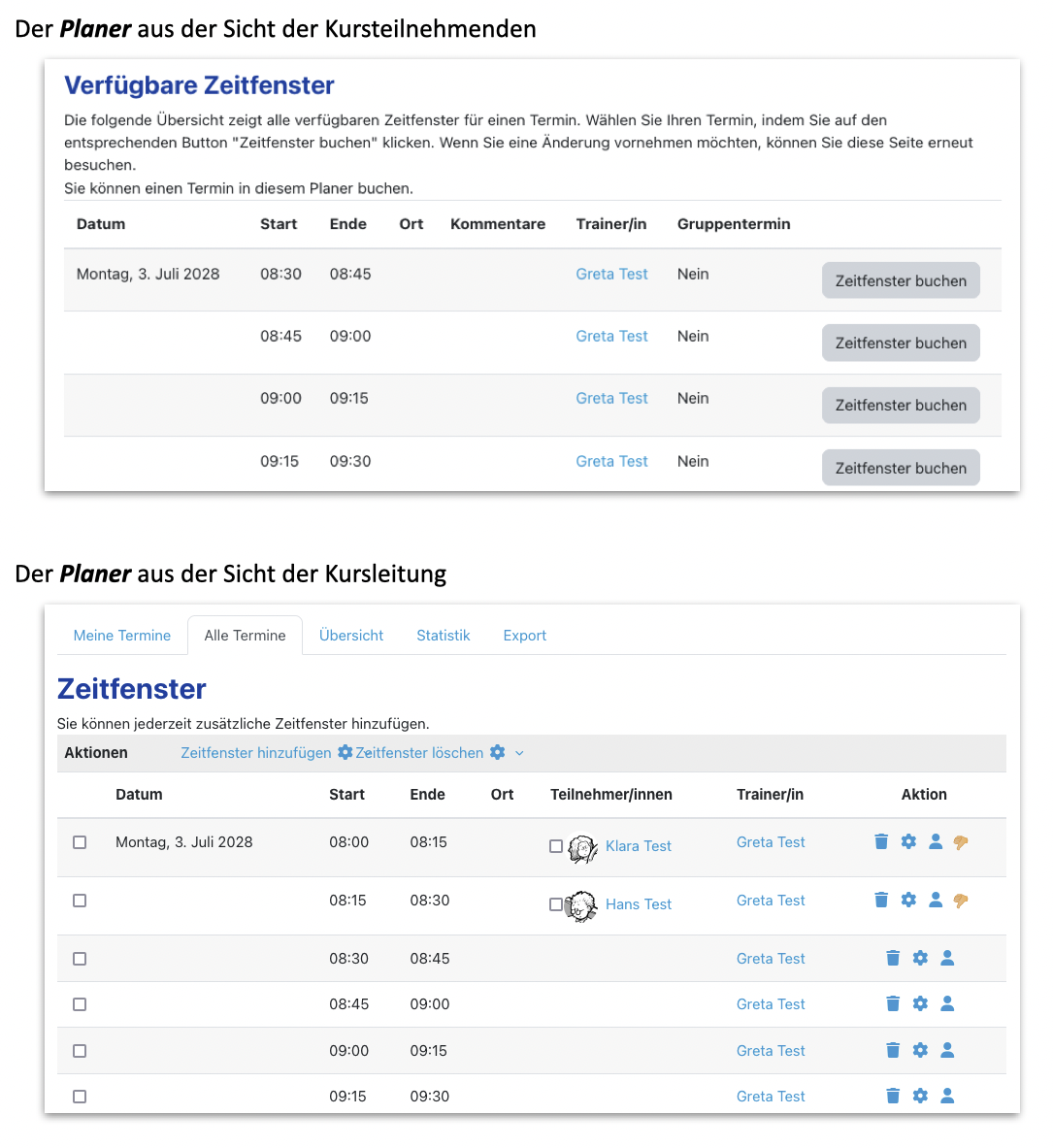 Der Planer erlaubt es einer/einem oder mehreren Lehrenden, eine Auswahl an Terminen anzubieten, die von einzelnen oder von mehreren Kursteilnehmenden gebucht und ggf. mit vorbereitenden Kommentaren versehen werden können. Damit lassen sich z.B. Sprechstundenzeiten oder Termine für mündliche Prüfungen organisieren.