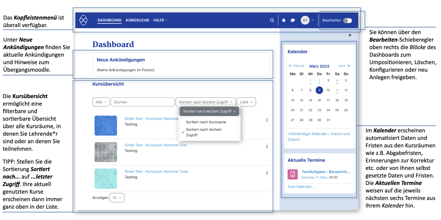Das Dashboard ist Ihre persönliche, von Ihnen gestaltbare Informationszentrale im Moodle. Es bietet Ihnen eine individuelle Übersicht über die Kurse, in denen Sie Lehrende*r sind, als auch die, an denen Sie teilnehmen.