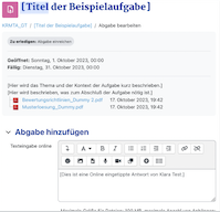 Die Aktivität Aufgabe dient als konfigurierbares Postfach, um quittiert Texte oder Dateien abzugeben. Einstellbar sind z.B. Zeitraum, Dateiart oder Gruppenabgaben. Als Verwaltungstool kann die Aufgabe dazu dienen, die Abgaben zu kommentieren, zu bewerten, tabellarisch darzustellen und/oder als ZIP-Ordner herunterzuladen. PDF-Dateien können dabei in Moodle selbst betrachtet und annotiert werden.